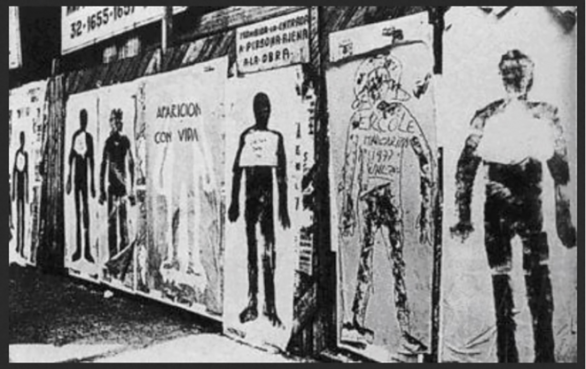 Também, durante a ditadura argentina, em 21 de setembro de 1983, na intervenção artística em Buenos Aires intitulada El Silluetazo, os manifestantes, apoiados por agrupamentos estudantis, jovens e organismos de defesa dos direitos humanos, delinearam silhuetas em cartazes que colocaram na Plaza de Mayo, representando a ausência dos desaparecidos, os quais foram eliminados impunemente pelo estado opressor6 (figura 3).