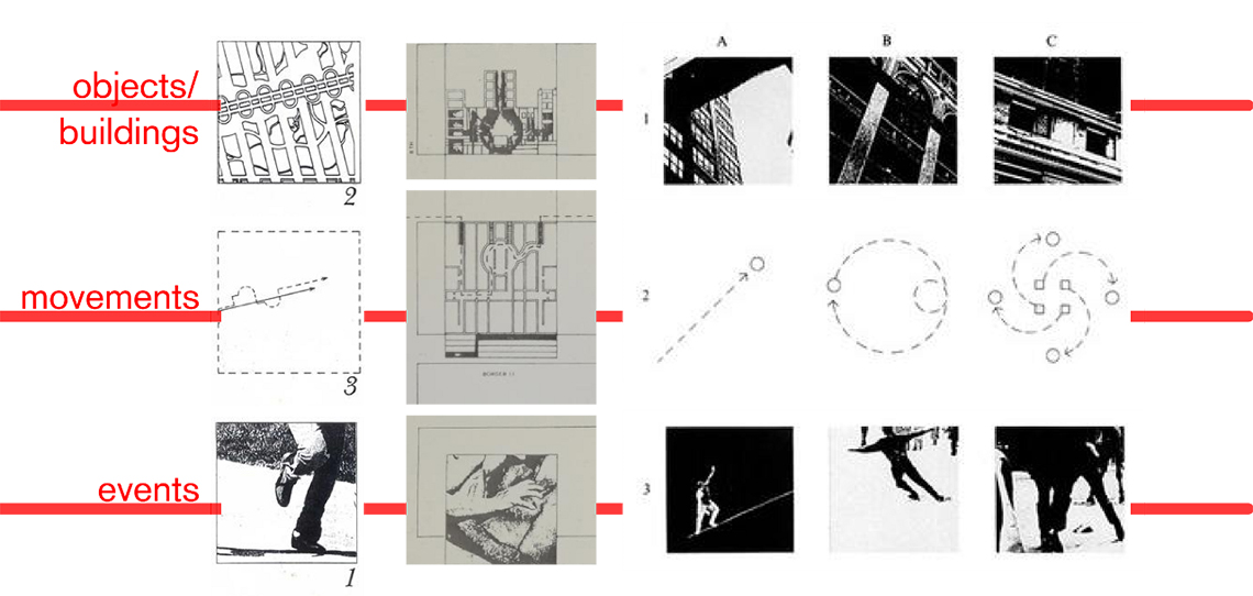 Foregrounding essence over form is Tschumi’s main theoretical aspiration in the sense of re-evaluating the role of architecture in the practice of personal freedom. The foundation of this approach is connectivity and dynamism, as there is no fixed relationship between architectural form and the events taking place within it, instead it is a dynamic and conflictual relation. Tschumi’s Manhattan Transcripts explore this relation as an attempt to re-narrate an architectural understanding of reality.
