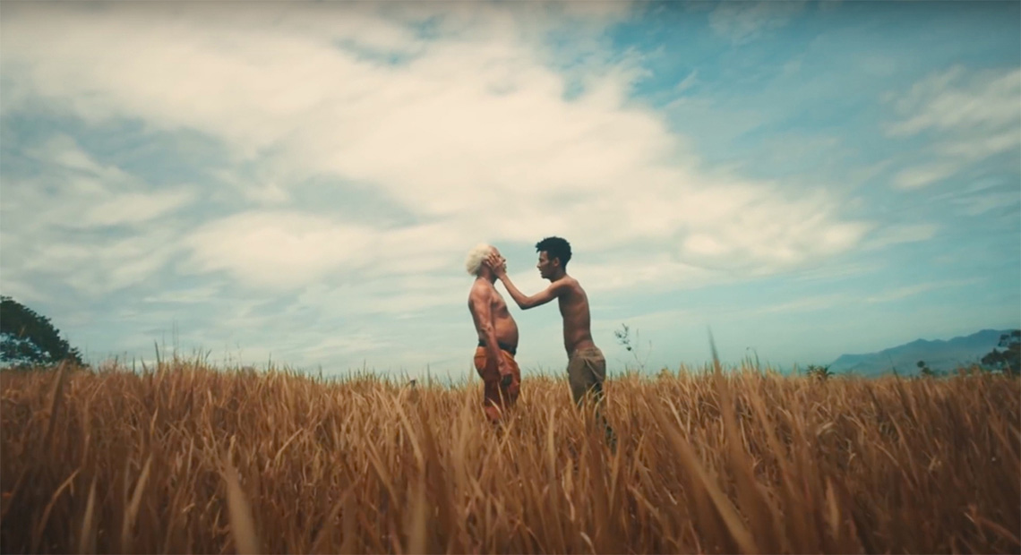 A resposta do pequeno Caique à pergunta feita nos primeiros vinte segundos do curta nos leva para a visão do futuro que deseja para si: ser médico. Essa cena é o prólogo que anuncia o tema da narrativa que vamos acompanhar, isso porque a cena seguinte nos faz pensar em um significado que é subvertido no final. Na sequência vemos um jovem negro – interpretado pelo ator Kelson Succi – correndo pela rua. O que nos faria pensar no motivo para a corrida e concluir que se trata de uma fuga é invertido quando sabemos que, no fim, o jovem negro corria em direção ao conservatório de música. O título do curta surge na tela e somos levados pela narrativa entre esses dois pontos cuja trilha sonora é composta por três das músicas do álbum: BLUESMAN 9, Preto e prata10, e Queima minha pele11. Logo após o título, o recorte no centro da tela que continha Caique, e a seguir o rosto do jovem negro correndo se amplia. Vemos então, preenchendo a tela, a corrida em meio a uma névoa onírica que será intercalada com cenas ilustrando alguns dos temas do álbum que o vídeo promove. Ouvem-se as notas da primeira música, BLUESMAN, e a voz de Muddy Waters, músico norte-americano considerado pai do Blues de Chicago. “Ooh, yeah. Everything, everything, everything’s gonna be alright this morning (Ooh, yeah. Tudo, tudo, tudo irá ficar bem esta manhã)”. É então que, com um corte, vemos o protagonista em um cenário bucólico indo ao encontro de um homem mais velho – interpretado pelo ator Hilton Cobra – para lhe oferecer um gesto carinhoso, o respeito à ancestralidade surge na imagem ilustrando a letra que nos mostra o conceito que Baco atribui ao blues. “Tudo que quando era preto era do demônio / E depois virou branco e foi aceito, eu vou chamar de blues” (Exu do Blues 2018).