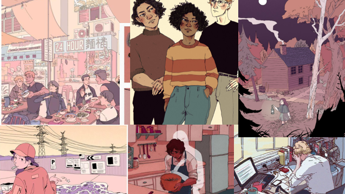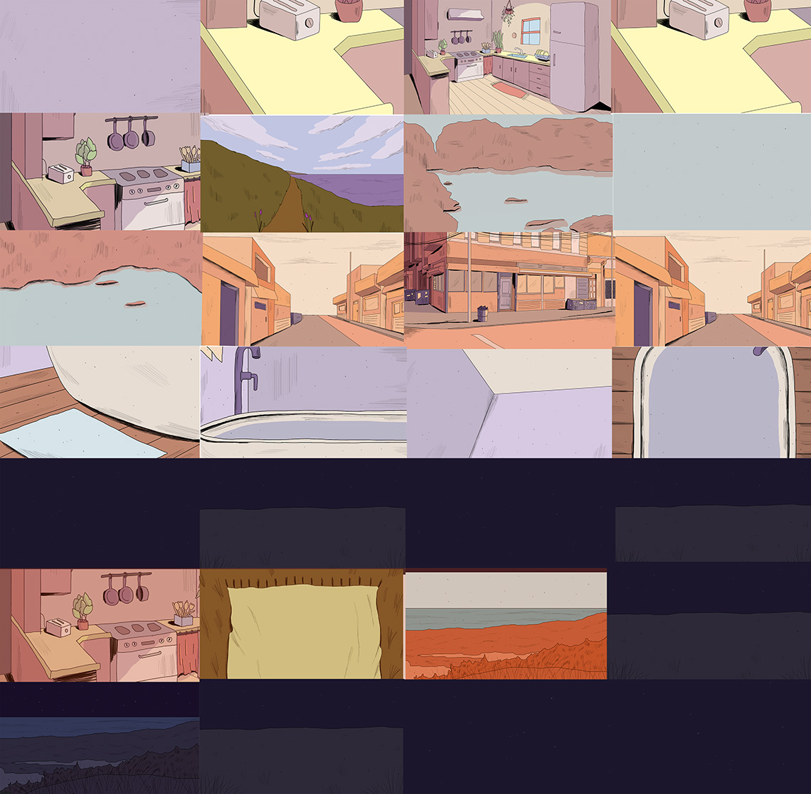 Foram utilizados tons pastel para as cores. A lineart não precisava ser necessariamente reta e também foram acrescentadas texturas rabiscadas para detalhar mais cada cenário.