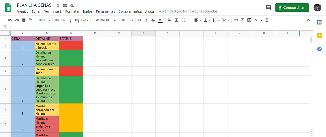 Com o animatic foi possível estabelecer o tempo de cada cena, o lugar das falas, a duração do curta, quantas cenas teriam, etc. Para facilitar a gestão do trabalho, foi feita a decupagem das cenas e uma planilha de conclusão de cada uma.