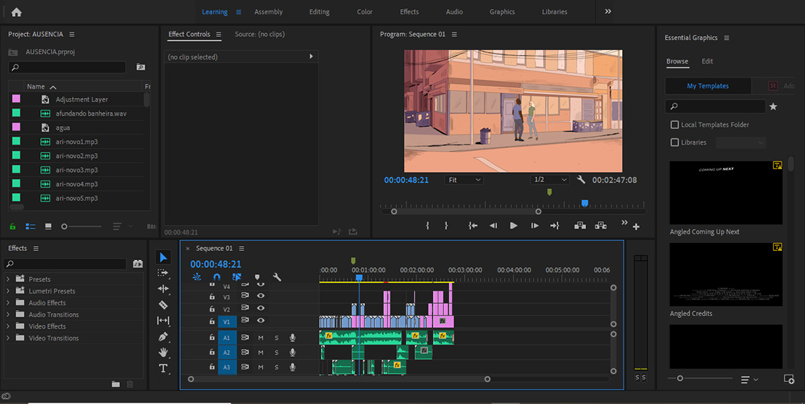 As cenas foram montadas e as falas foram encaixadas nos devidos lugares. Depois foi a vez de aplicar os efeitos sonoros. Foi feito o download deles pela plataforma Freesound, plataforma essa em que são disponibilizados efeitos sonoros de forma gratuita.