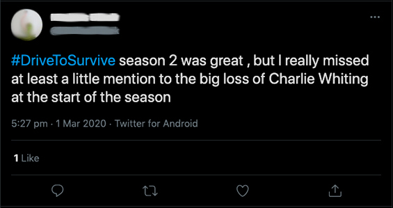 Como Manovich (2017) ressalta, “as redes sociais não incluem todo mundo, e o conteúdo compartilhado às vezes é específico”. Isso transparece na ligação dos fãs do esporte pela atenção aos detalhes e a exigência de não ignorar fatos e informações importantes para a comunidade. É possível observar o quanto as perdas durante 2019 foram mencionadas, 3,2%, e a ausência de histórias como o caso do piloto então novato Lando Norris e as equipes Alfa Romeo e Racing Point, como já dito.