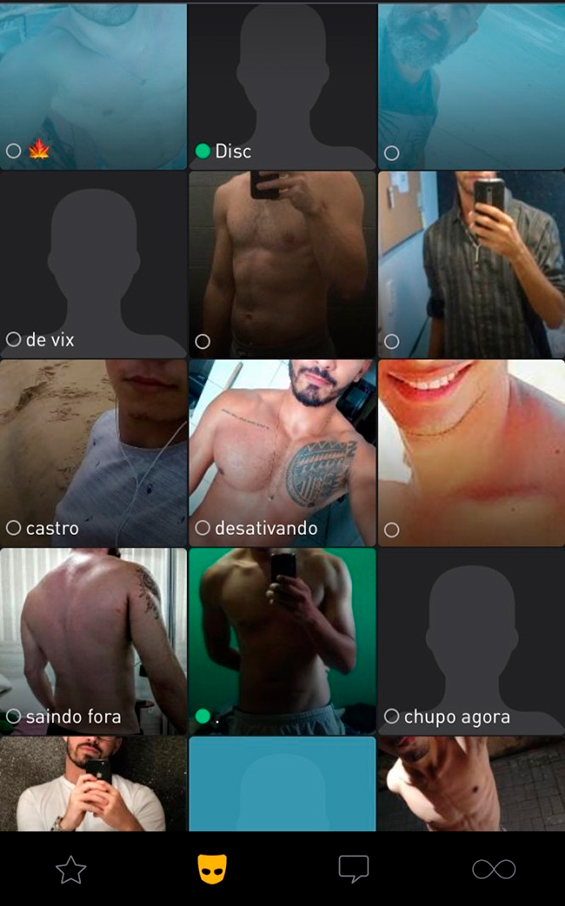 Portanto, Grindr, cuja acepção semântica provém do inglês grinder, que significa “moedor, triturador” (CAMBRIGDE, 2015: p. 316), pode ser compreendido como uma máquina de triturar visibilidades. Em sua interface radial, que reagrupa os perfis próximos ao do usuário, os rostos ou estão ausentes, ou cortados geralmente na altura da boca, criando-se um painel de invisibilidade. Estes mesmos perfis se autodenominam através de: 1) nomes próprios; caso mais raro em sua recorrência; 2) emojis (pequena imagem digital ou ícone para expressar uma ideia ou emoção); 3) qualificações ou atributos do usuário, tais como Tesão, Casal dotado; ATV S/L (abreviação para ativo sem local); Chaser Discreto; Sig (abreviação para sigilo ou sigiloso); 4) perfis inomináveis, sem descrição alguma; e 5) solicitações, por meio de sentenças rogativas tais como ME CHUPA AGORA); SIG afim (denotando que é sigiloso e está a fim de sexo), entre outros.