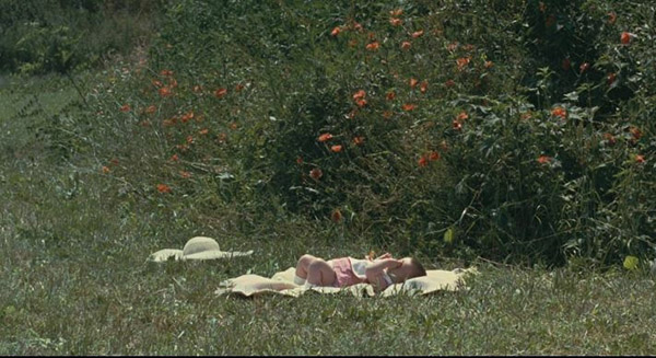 Nos primeiros minutos, presenciamos o nascimento de Édipo e a relação com sua mãe, Jocasta. Temos imagens de campos verdes, filmados em planos gerais e abertos, onde Jocasta amamenta seu bebê. A câmera, trêmula, percorre as árvores e o céu.