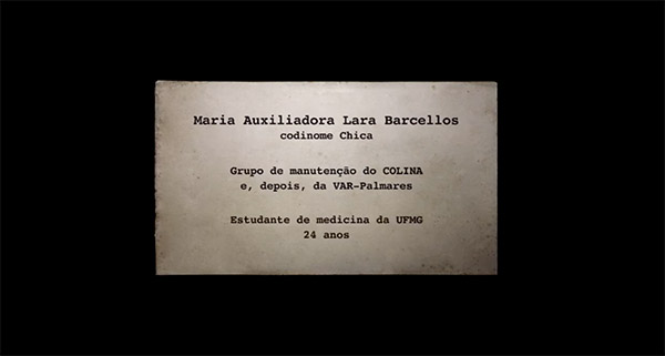 Ao longo de todo o percurso narrativo, as grafias do nome aparecem de diferentes formas, em documentos, registros, atestados, laudos, lista de exilados, na inscrição fílmica sob uma fotografia nomeando as mulheres, presas políticas, nos cartazes de procurados da repressão. O fluxo destas formas de nomear expõe a palavra articulada graficamente enquanto testemunho histórico, trazendo outras camadas temporais e imagéticas para a visualidade, reconfigurando a experiência histórica do espectador ao construir as identidades narrativas através destes elementos gráficos e dos rastros por eles mobilizados.
