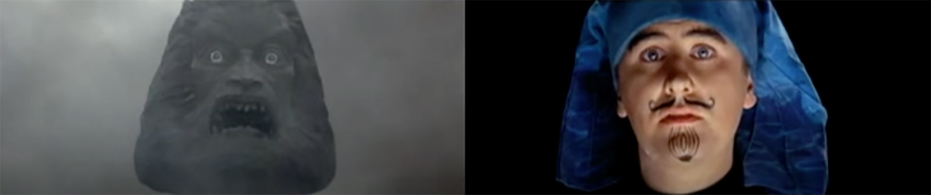 Zardoz is set at the end of the 24th century, in a post-apocalyptic world populated by the ultra-civilized Eternals, who lead lives of indolent luxury within the invisible walls of “the Vortex,” and the lumpen Brutals, scrabbling an existence of savage barbarity in “the Outlands” beyond. In this sharply stratified world, with its jarring combination of futuristic technology and pre-industrial feudalism, there are other social sub-sets. Within the Vortex we find the Apathetics, those Eternals who have been rendered immobile through melancholic ennui (“a disease that is slowly creeping through all the Vortexes”), and the Renegades, transgressors condemned to an immortality of infirmity and senility. Rampaging through the Outlands are the Exterminators, ultra-violent Barbarians commanded to slaughter the more primitive Brutals by their god, the eponymous Zardoz. Traveling through the sky in a gargantuan flying stone head, vomiting out guns and commands upon the waiting Exterminators below, Zardoz is, in actual fact, the creation of Arthur Frayn, a 300-year-old Eternal who, it appears, simply has bureaucratic responsibility for this particular region. [Fig. 2] But it is from those Exterminators, whom Zardoz describes as “the chosen ones,” that the renegade Zed emerges, gatecrashing his way into the Vortex in order to discover the truth of his own creation.