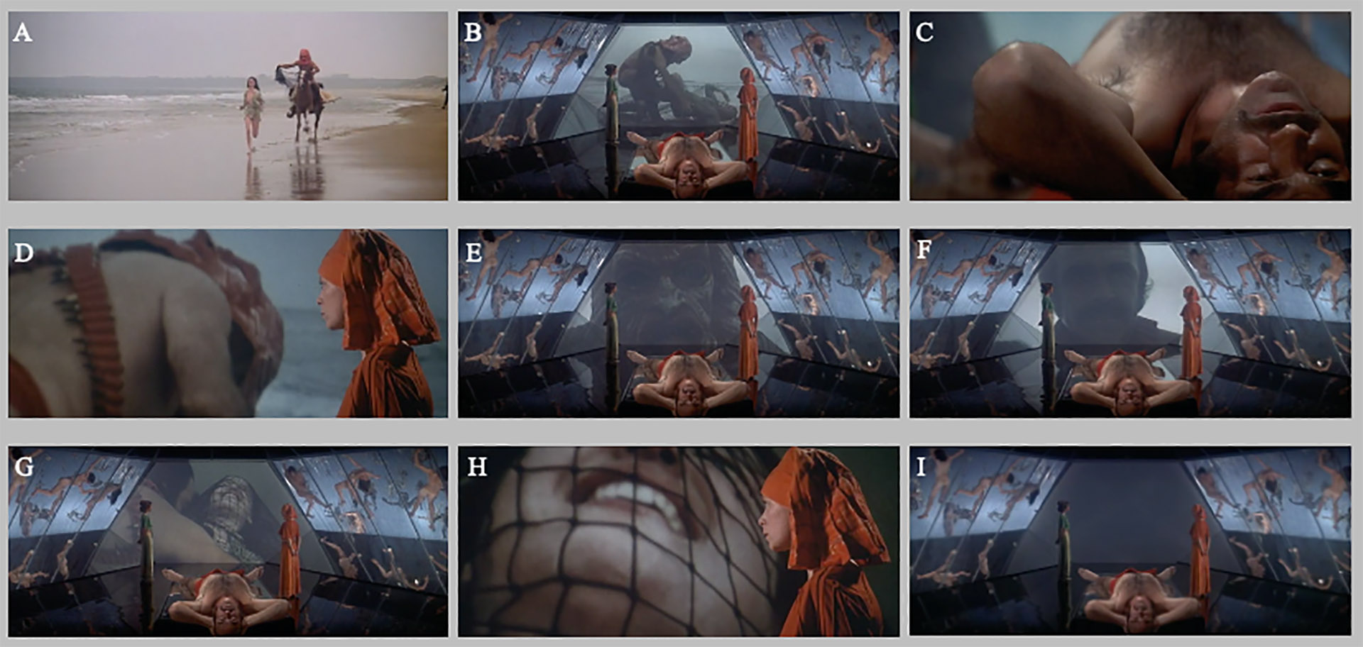 We, of course, are watching these screened memories just as we are watching Consuela and May watching them, as the memory-sequence itself plays ‘like a movie’ with a series of cuts, pans, close-ups, long-shots etc. Even though we are watching Zed’s subjective memories, the screen rarely shows his first-person perspective, positioning him almost entirely as an object of perception. This means that Zed is also perceiving himself as an object of perception just as we are. Interestingly, a series of cuts between May and Consuella as spectators of the memory is joined to a close-up of Zed’s face staring into the face of the woman he assaults, thus we as spectators of the movie Zardoz, are collapsed into the subject position of the victim, as May and Consuela are collapsed into one spectator-position within the frame itself. This draws us back to the paradox of Metz’s application of Lacan whereby we, as the spectators of film are not present in the screen though we recognize the traces of the mirror stage in its instantiation of ourselves as both subject and object. As Metz says, our identification as spectators is always with the camera and its positioning of us as “all-perceiving.” But for Zed, Metz’s claim that “there is one thing and one thing only that is never reflected in it: the spectator’s own body,” here loses a certain currency, for Zed really is in fact watching himself and literally projecting himself from his own memory bank upon the screens that surround him. In that sense, Zed is present in the screen, as he undergoes the process of self-realization. However, Zed simultaneously experiences the identification of the spectator-self with the camera in exactly the way that Metz describes, because the camera and Zed are in fact one and the same. As Metz puts it: “the film is what I receive . . . [r]eleasing it, I am the projector, receiving it, I am the screen; in both these figures together, I am the camera, which points and yet records.”36 For Zed it is literally true that “the spectator himself is part of the apparatus.”37 Thus falling somewhere between the infant mirror stage and the fully adult engagement with the cinema screen as mirror, Zed is both “able to constitute a world of objects without having first to recognize himself within it”38 as well as exist like the child, “both in it, and in front of it.”39 Our application of the mirror stage as the catalyst for Zed’s emergence into ego and consciousness is further emphasized by the second critically important scene, when Zed descends into the mirrored pyramid where May pushes the connection between the screen and selfhood even further and more explicitly. It begins with them both standing outside of the pyramid, Zed contemplating himself in the mirror. After his descent into the interior Zed is surrounded by multiple reflecting screens that reveal both exteriority and interiority as the ground of ego formation. The screen/mirror surrounds Zed as May commands him: “Look at it. It’s you.” [Fig. 7]