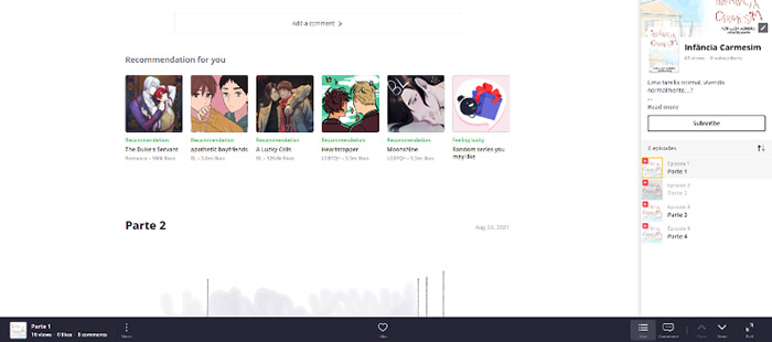 Figura 1 - Interface da plataforma Tapas, mostrando títulos indicados entre as partes 1 e 2 da obra Infância Carmesim.