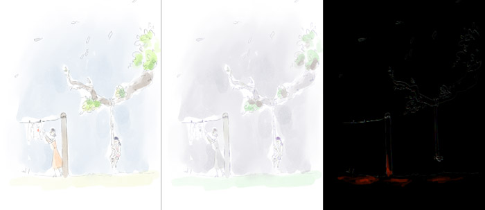 Durante a pré-produção do projeto, fez-se a escolha criativa de que a pintura dos elementos em cena no projeto teria textura de aquarela. Para traduzir isto à animação, foi necessário pintar os preenchimentos em camadas separadas e aplicar a textura durante a pós-produção.