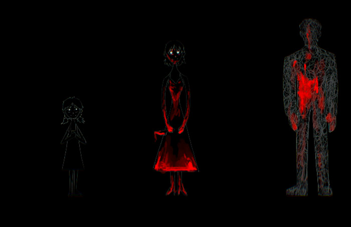 Por último, no terceiro desenho, a paleta de cores foi substituída por apenas três cores: branco, preto, e vermelho. Essa paleta final, motivada pelo clipe In Your Eyes, reduziu os sentimentos das cenas para medo, ódio e incerteza (HELLER, 2000).
