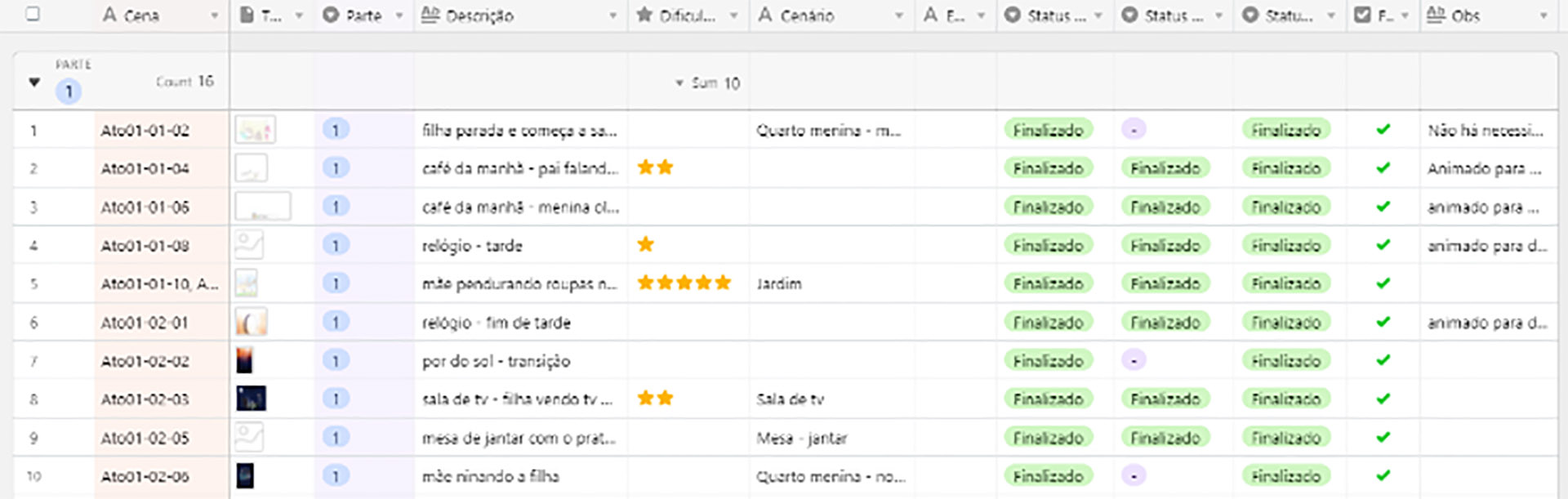 Para controlar a produção do projeto, criou-se uma tabela com informações sobre as cenas, dificuldades para animação, efeitos necessários e status de conclusão. A plataforma escolhida para a tabela foi o Airtable, por dispor das opções desejadas para o projeto.