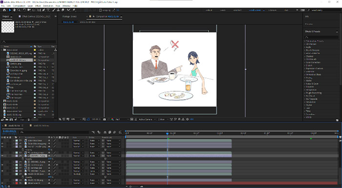 O processo para a composição das cenas animadas iniciou-se ao importar as imagens com a configuração de sequência de imagens, que gerou automaticamente um vídeo a 30 quadros por segundo. Selecionada a primeira imagem da sequência de quadros renderizados no programa Rough Animator, o After Effects permitiu a opção de importação de todas as demais como uma sequência de PNGs.