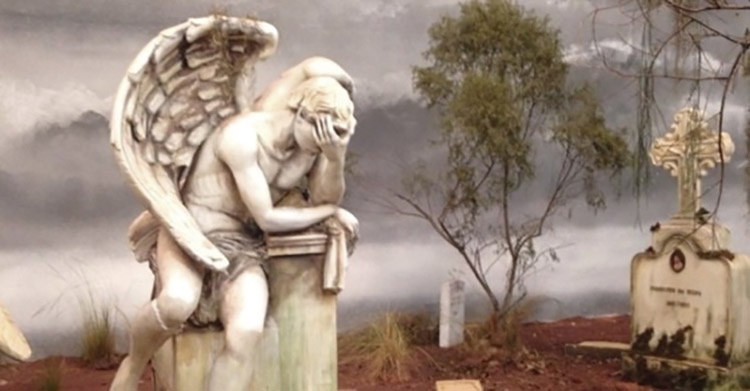 Por isso, que observamos no cenário do cemitério referências da estética expressionista alemã na atmosfera acinzentada e sombria, árvores com poucos galhos, ambientes desgastados e abandonados. Da arte gótica, percebemos a rigidez da postura de determinadas esculturas, além das caveiras. Da arte tumular, a simbologia dos objetos criados e eternizados para referenciar os mortos. E da arte barroca, a escultura dos anjos crianças que exalam pureza, logo equilibram as imagens de dor e sofrimento dos anjos sofredores.