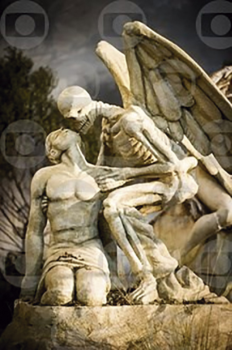 No cenário do cemitério, ao lado das esculturas de anjos sofridos, de crianças, temos também esculturas de caveiras. Declercq cita Bortulucce (2016, p.01) para explicar que essas esculturas são um clássico do século XIX: “é o momento morri (‘ lembre-se de que você vai morrer’), nós que aqui estamos por vós esperamos”. Na figura 14, o esqueleto está com asas simbolizando que é um anjo, mas pelo gestual que parece sugar a energia da escultura de um homem de joelhos, percebemos que se trata de um anjo da morte.