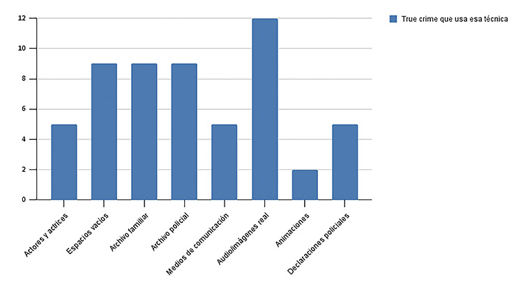 La Figura 3 refleja el tipo de recreaciones que usan los true crime analizados en esta investigación. La más recurrente, ya que la usan todas la series, es la inclusión de archivos reales, ya sean vídeos, fotos o audios para reconstruir el caso. Otra técnica de las más usadas es mostrar espacios vacíos para que así el público pueda imaginar cómo sucedieron los hechos en esos lugares.