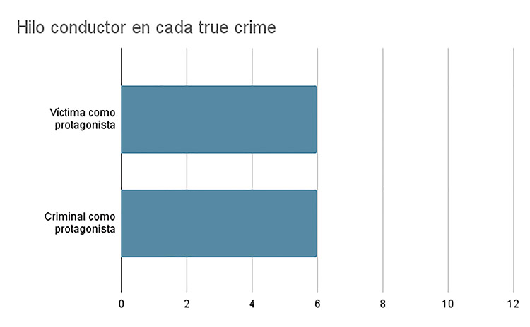En cuanto a la temática de estos true crime, nueve de las trece series analizadas, tratan sobre crímenes de sangre, es decir, asesinatos. Dos de ellas sobre abusos sexuales y otras dos relacionadas con sectas. En los apartados analizados, la cantidad de imágenes del juicio y el tipo de recreaciones que hay en cada true crime son importantes para poder entender las características de estos documentales.