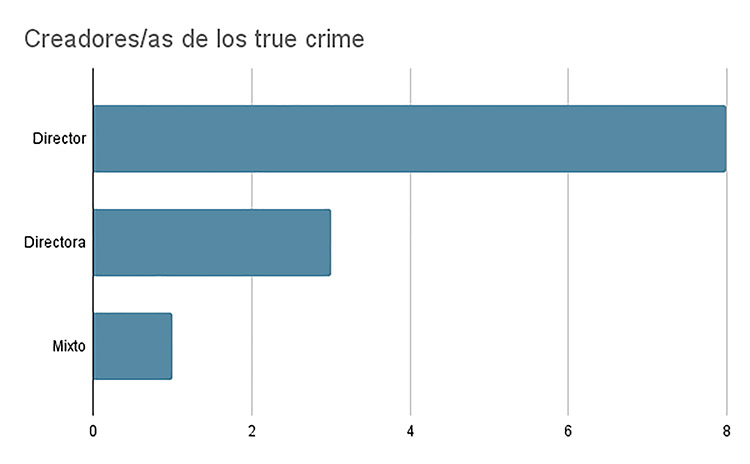 Es interesante poner el foco en ciertos datos extraídos del análisis. En la Figura 4 vemos que en la mitad de los true crime españoles estudiados hay participación del autor o autora de los hechos, ya sea a través de llamadas telefónicas o carta porque está en la cárcel, o una entrevista canónica hablando a cámara. Asimismo, en la Figura 5 se observa que no existe una tendencia clara tendencia clara de si el true crime español apuesta más por contar los hechos desde el prisma de la víctima o del/la criminal. En contraposición (Figura 6), hay más directores que directoras haciendo este tipo de contenido para las plataformas digitales. Bien es cierto, que los tres true crime dirigidos por mujeres son aquellos donde la víctima es una mujer.