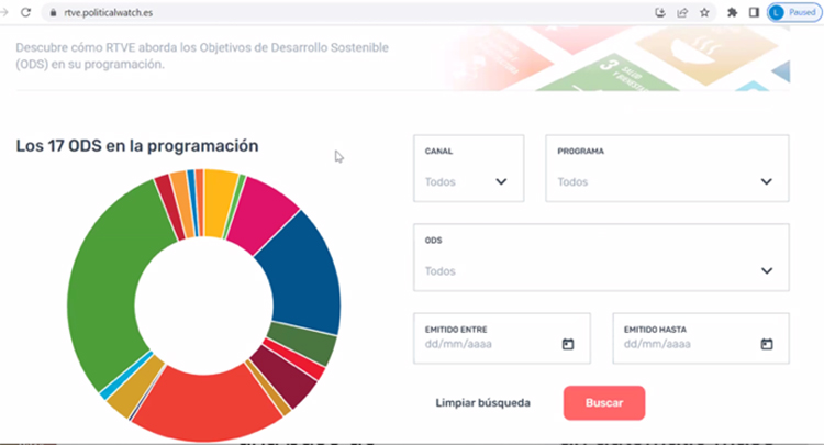 Again, as in the case of Albert, no information is provided about the corpus, tools or methodology beyond what is published on the website. Like Albert, RTVE’s analysis lacks scientifically rigor. However, it does provide a valuable example of how to collect indicators for sustainable media content.