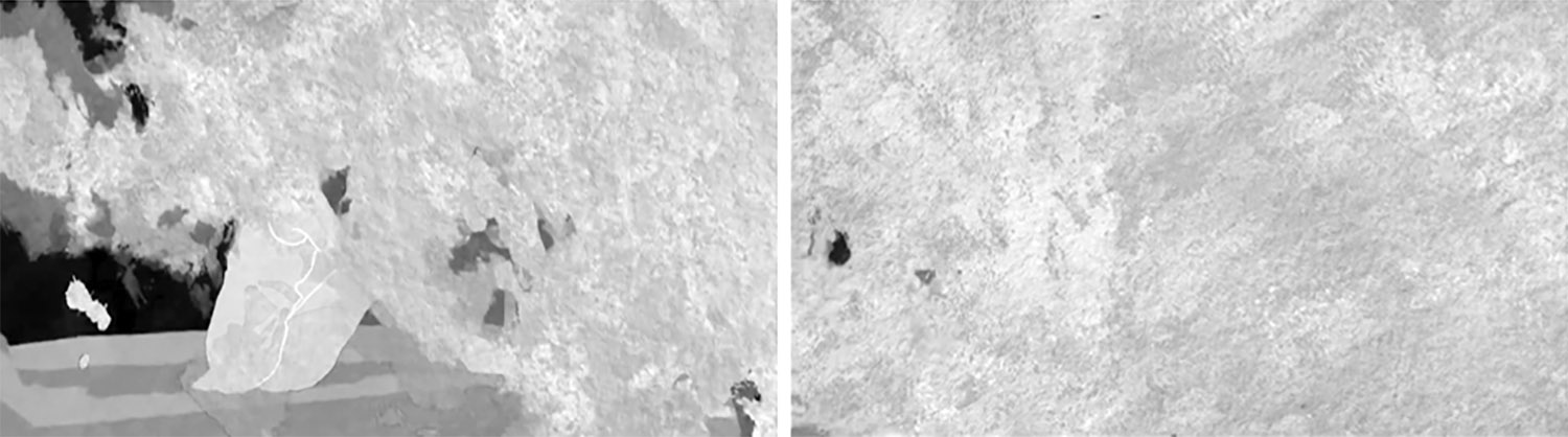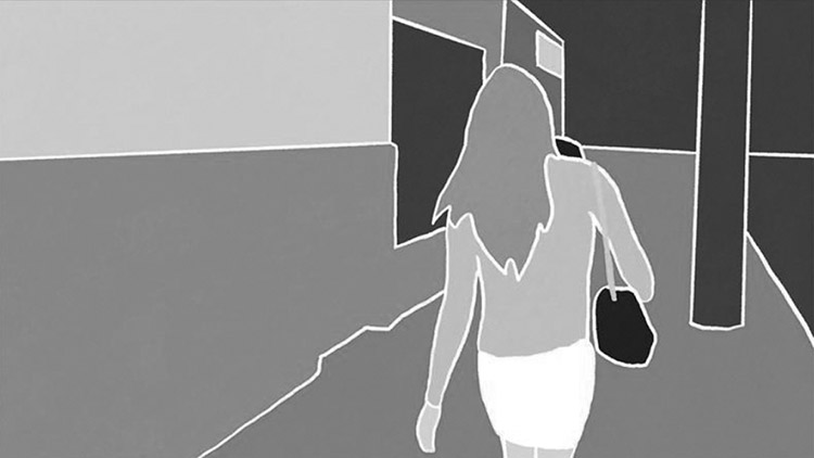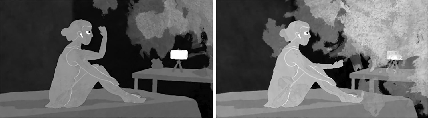 As mudanças de cena utilizam uma linguagem de fade out desenvolvida em animação, que consiste na progressiva ocupação do quadro por um borrão monocromático. Este borrão foi obtido através de um pincel do Procreate, e é um elemento recorrente da linguagem de todo o filme.