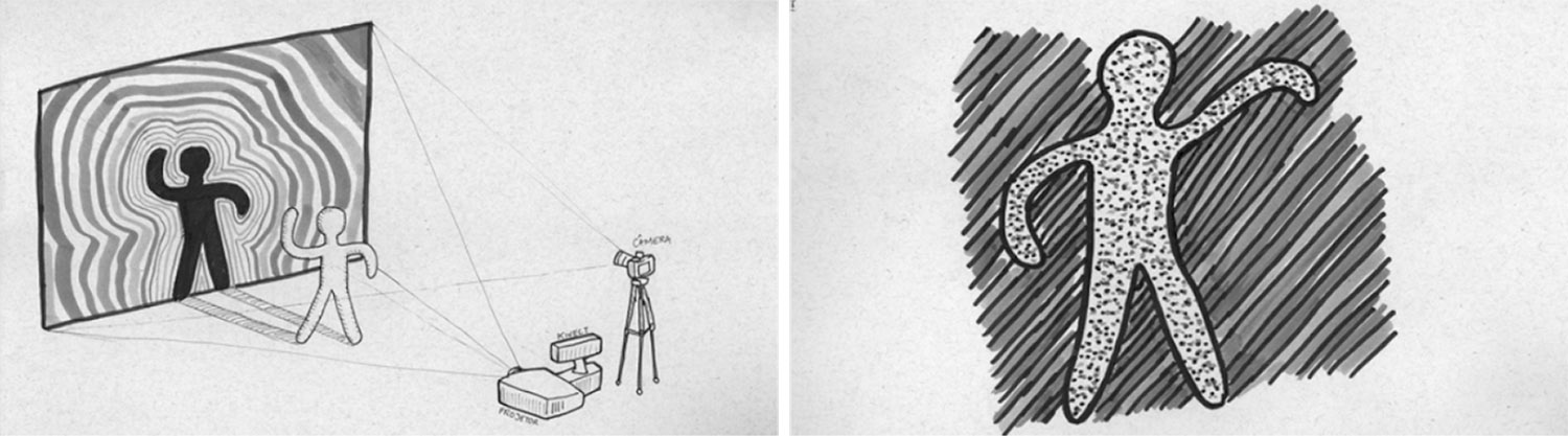 Os primeiros esboços de ideias para o trabalho (Figura 9) mostram o investimento de seus autores em criar alternativas de preenchimento das áreas fora e dentro da sombra do usuário. Está expressa, também, uma proposta de experiência em que os usuários são imaginados de frente para a superfície de projeção, divertindo-se com as alterações de sua própria imagem, uma definição reforçada posteriormente pelos testes de usabilidade e protótipos de experiência (Figura 10).