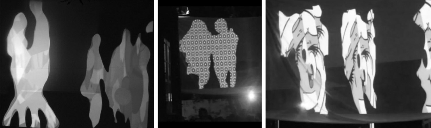 Cabe apontar que a captura, sendo feita por sensores (do Kinect), não está a serviço do realismo fotográfico. Esta técnica serve tão somente ao fornecimento de um contorno básico dentro do qual o programa em Processing opera variados efeitos gráficos. O código de programação transforma a imagem capturada em contornos preenchidos pelas mais variadas imagens, desde composições abstratas até, de modo dadaísta e pop, figuras de quadrinhos, filmes e outras imagens apropriadas (Figura 12). Os espectadores, no contexto da festa, ao observar as silhuetas dançantes, pressentem que as figuras projetadas correspondem a outros frequentadores que estão dançando em algum local próximo. Isto se dá pelo caráter não encenado e não narrativo deste ‘filme em exibição’, no qual personagens, ora se movimentam, ora dançam, ora estão simplesmente parados, conversando.