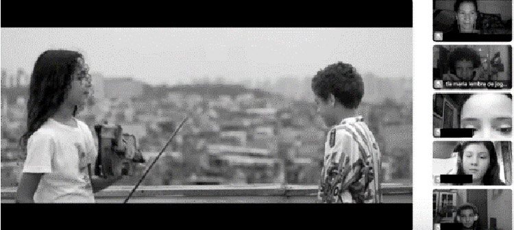Bento (2020) destaca que o objetivo da oficina era sensibilizar os alunos à linguagem do cinema, experimentar novas temporalidades na relação consigo e com o outro e alimentar as crianças com imagens de infâncias diversas, relembrando o prazer de estar no mundo, de brincar, de saber que existem outras infâncias; tendo como meta trabalhar suas subjetividades e pensar o cinema como uma janela para o mundo de fora e o de dentro. Foram realizadas 10 sessões online, através de plataformas de videoconferência que reuniram alunos entre 10 e 12 anos. Com o uso do telemóvel, os alunos assistiam e analisavam curtas e realizavam exercícios de performance, criação e edição. Em relação às questões pedagógicas, a oficina dialogou com a pedagogia da criação e o tratado de transmissão do cinema nas escolas, defendido pelo crítico francês Alain Bergala (2008). Uma pedagogia que está centrada na criação e é evidenciada tanto quando se realiza como quando se assiste um filme, por considerar o cinema não como um objeto, mas como marca final de um gesto criativo, estimulando a leitura criativa do filme, levando o aluno a imaginar as escolhas e possíveis incertezas do diretor, vivenciando, desse modo, as emoções do processo criativo.
