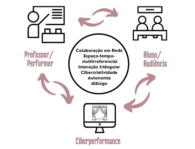 Figura 6-Processo de ensino-aprendizagem em ciberperformance. Esquema inspirado em Lucena, Santos e Oliveira (2020) e adaptado para a ciberperformance.