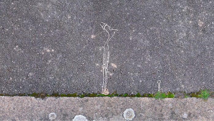 Como observável na sequência 2 (A,B,C,D), assistimos inicialmente à intensificação do efeito de espanto, perante uma observação com lupa, de pequenas plantas que emergem de uma estreita fissura no espaço alcatroado (2A e 2B). Através do qual o explorador se permite mergulhar, solo adentro, chegando mesmo entrar na fissura (2C). Como efeito do que imerge numa linha, parece atravessá-la com a segurança de um retorno ao plano principal da imagem, o que permite a leitura de um contacto com limite, mas um aprofundar com segurança. Após emergir da fissura, dá continuidade ao percurso e faz a descoberta de outras plantas (2D).