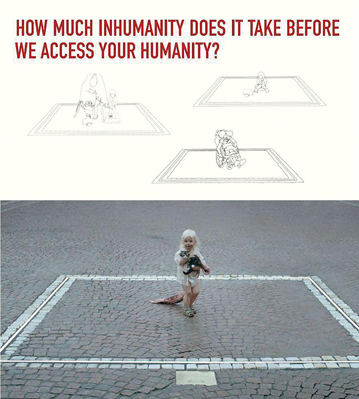 18O vídeo, aberrantemente apelativo, mostra uma linda menina loura e maltrapilha de 5 ou 6 anos, numa caricatura de “criança homeless”, literalmente sendo explodida no interior da obra The square. A linha conceptual adotada era “veja o que pode acontecer se você não demonstrar empatia pelo outro”, supostamente em conexão com a proposta artística.