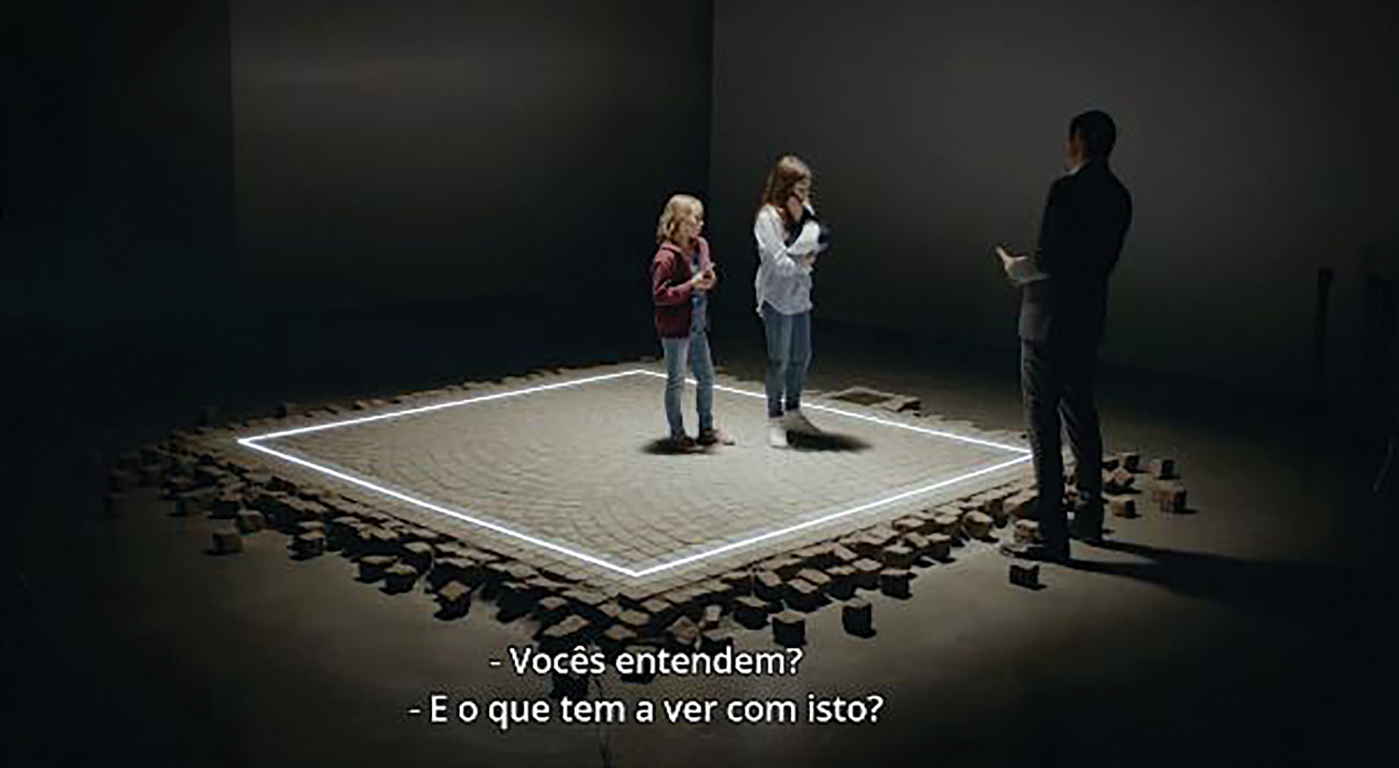 O museu integra um conjunto arquitetônico histórico, e a montagem da obra The square envolve uma complexa operação de retirada de parte do calçamento exterior e a demolição de uma estátua barroca para viabilizar sua instalação nos termos estabelecidos pela artista – o que já consiste em um comentário sarcástico sobre os caprichos em torno de certos criadores de arte contemporânea. Em uma cena emblemática do filme, operários tentam remover a estátua, que representa um personagem histórico montado em um cavalo, em uma operação logística complicada. No meio do processo, a pesada escultura se parte, decapitando a figura e destruindo o pedestal – e toda sua inerente carga simbólica – sobre o qual ela estava. É dessa forma pouco sutil que é apresentado o contexto de instalação da peça The square4 (Figura 1), que será ali implementada; no local do pedestal retirado é demarcada e instalada a área quadrada, um espaço de 3 x 3 m delimitado por uma faixa de luz branca e uma placa assinalando sua existência e afirmando a natureza da proposta. No interior do museu, a peça é complementada por uma intervenção “interativa” na qual os visitantes, para acessarem o espaço, devem indicar, apertando um botão, se “confiam ou desconfiam” das pessoas. A opção escolhida irá determinar percursos diferentes a serem realizados pelo público.