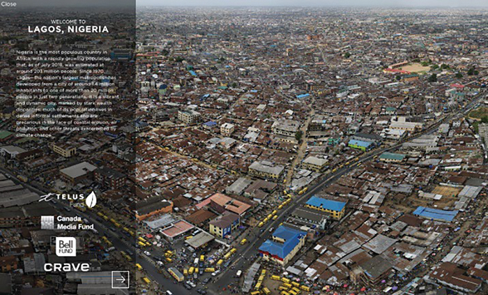 Upon starting one of the chapters, we are introduced to the context of our immersion. For instance, in the case of Lagos we learn that Nigeria is the most populous country in Africa, with rapidly growing population that was estimated at around 203 million people at the time of the production, while the Lagos itself has more than 20 million. Simultaneously vibrant and dynamic, it is also precarious, with stark inequalities.