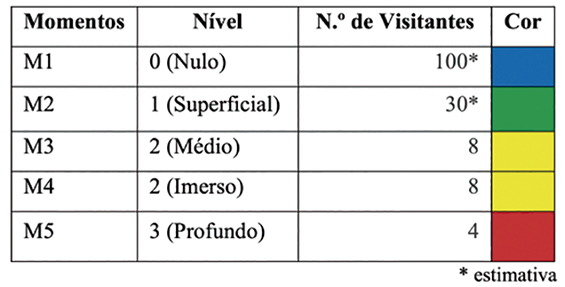 Na tabela 2 apresentamos os resultados dos dados recolhidos, com números de participantes, momentos atingidos e níveis de envolvimento. De modo a proporcionar uma perceção gráfica do envolvimento obtido, atribuímos cores aos diferentes níveis de imersão, numa escala de cor fria para indiferença e cor quente para imersão total (figura 8).