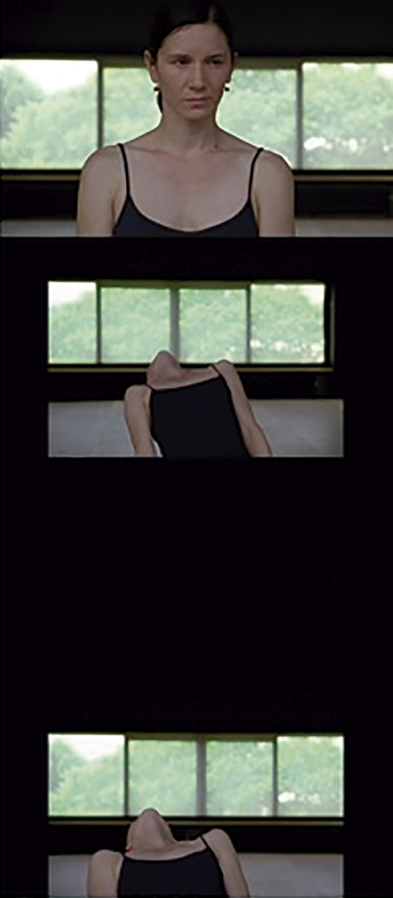 Otra pieza que trabaja con el sonido y su «desaparición» es Dissonant12. Pantalla en negro, suenan las primeras notas de Three Sonatas for Violin Solo13. La imagen aparece y muestra a la bailarina Cynthia Loemij de frente durante dos minutos escuchando la composición. El espectador escucha mientras la ve escuchar. No es hasta que la melodía se detiene, que el cuerpo de la bailarina empieza a danzar así revelando la escucha anterior como un estado latente y gestador de la coreografía que luego despliega. La cámara, siempre desde una frontalidad, lucha por mantener la figura enmarcada en sus movimientos expansivos por el espacio. En un momento del recorrido, la bailarina enlaza la coreografía con la posición inicial, encorvando el cuerpo hacia atrás, y la pantalla vuelve al negro.