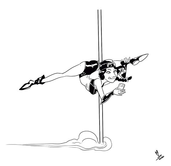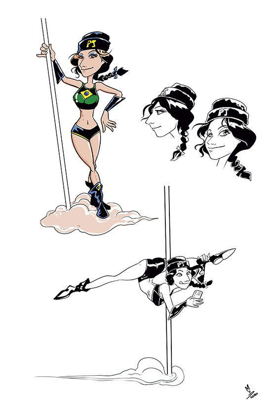 E, na tentativa de traduzir para traço o que Pussy representa em suas entrelinhas narrativas, inclusive o aspecto interseccional explícito com a autora, Cláudio elenca, para caracteriza-las, um foco pouco explorado na plataforma, mas parte constituinte do universo Pussy em simbiose com sua criadora: a prática do Pole Sport. Massivamente conhecido como Pole Dance.