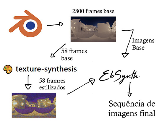 A ferramenta Ebsynth é um software que produz “example based synthesis”, em contraste com outros algoritmos que têm por base o machine learning. Toma como input; uma sequência de imagens do vídeo base, um conjunto de “frames chave” - keyframes estilizados (que irão influenciar o estilo dos restantes).