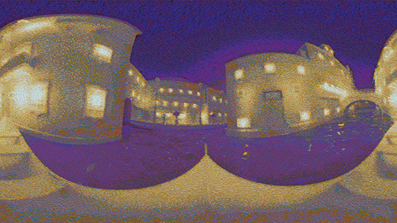 O maior obstáculo do workflow adotado foi, sem dúvida, o tempo de renderização. A renderização dos frames, que se executa a partir do Blender, necessita de ter uma resolução de 5376px x 3024px para que depois da estilização resultem imagens com qualidade que permita a identificação de “pinceladas” individuais. Para a estilização de uma imagem convencional, que não tenha como intuito ser vista como um ambiente de realidade virtual, o processo de renderização e estilização é deveras mais acessível. Isto porque a estilização é aplicada e escrutinada na mesma escala. Os artefactos vindos da estilização são compreendidos na escala da imagem. Em contraste está a imagem equiretangular, usada nas visualizações panorâmicas 360º do espaço, na qual a totalidade do campo de visão da câmara é captado e projetado numa imagem retangular. A imagem equiretangular é criada e processada com a sua escala real, mas é olhada e escrutinada a uma escala muito mais detalhada, dado à natureza da experiência da imagem 360º. O utilizador, em tempo algum, irá experienciar a totalidade da imagem, sendo que, os artefactos e, por sua vez, os detalhes da estilização deverão ter isto em conta. Assim, com a resolução existente no projeto é possível ao utilizador explorar a textura dos frames do vídeo com alguma liberdade.