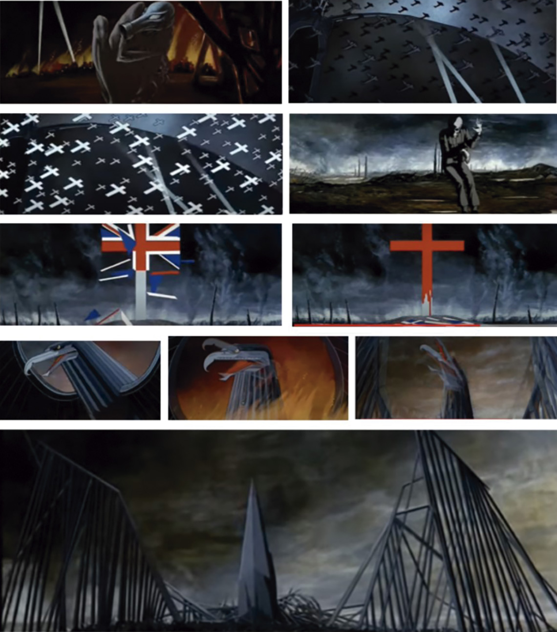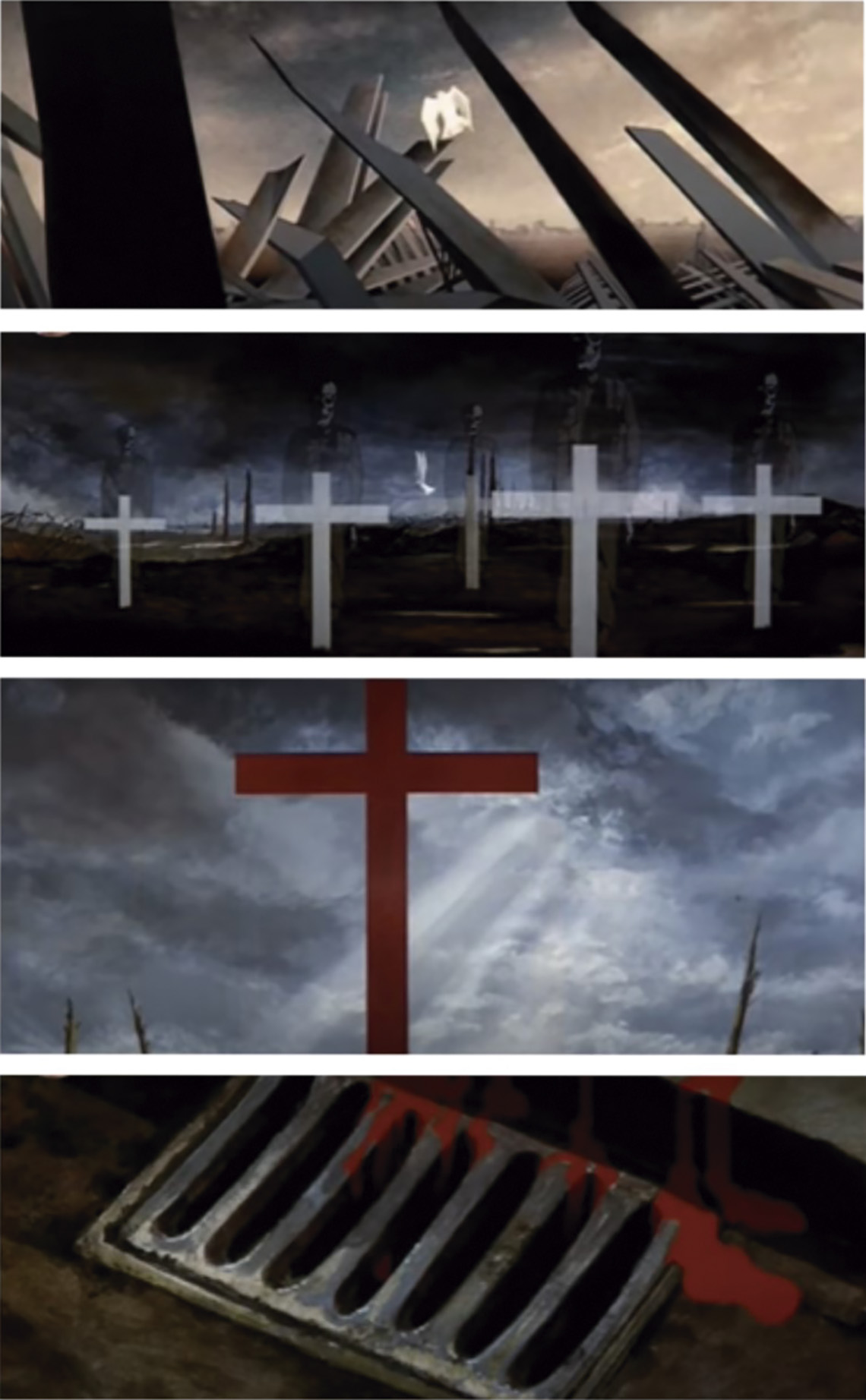 O horror da guerra é cantado e visualizado. Pomba, ave, avião e em seguida, as cruzes cobrem o céu (Figura 3). A morte se faz presente e o símbolo da pátria se desmancha. É a bandeira que se torna a imagem da cruz, encharcada de sangue inocente. Do céu, surge novamente a ave raivosa que se transforma, em meio as chamas, em destroços e ferros retorcidos.