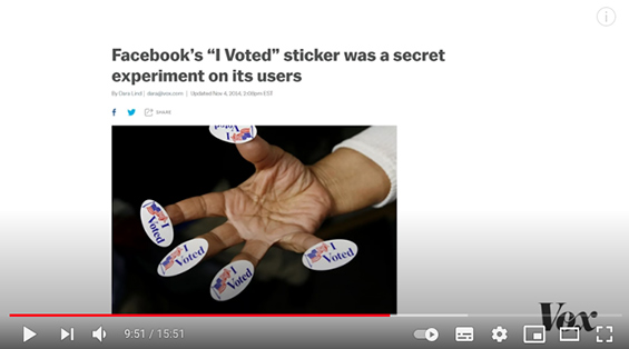 Assim, o vídeo relata mais um experimento. Com um botão “I voted” durante uma eleição nos Estados Unidos de 2010, houve aumento de participação dos seus usuários nas eleições, considerando que no país o voto é opcional. Se este estímulo for apresentado apenas para um grupo de eleitores ou para quem vota em um determinado candidato e não em outro, isso poderia mudar uma eleição (IAMARINO, 2020, online).