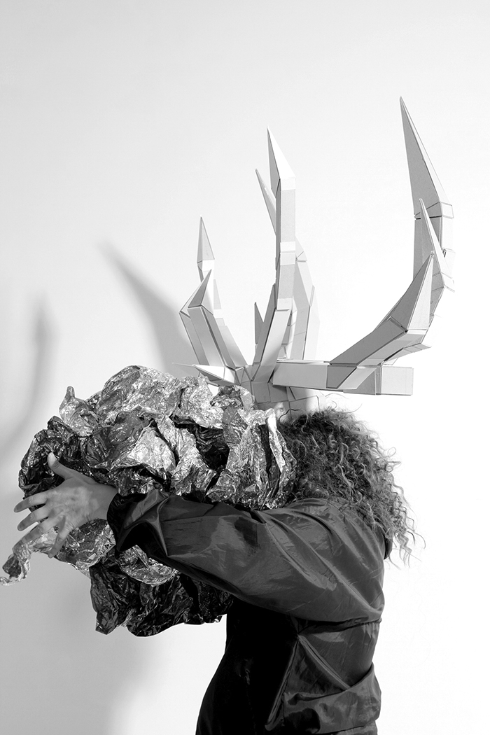 E alcança um nome próprio, “Nahui Ollin”29 : é mais que uma escultura, é um chapéu cerimonial, com chifres de veado, feito de cartões e revestido de fita-cola prateada, que evoca um ritual arquetípico “qualquer” (hidden).