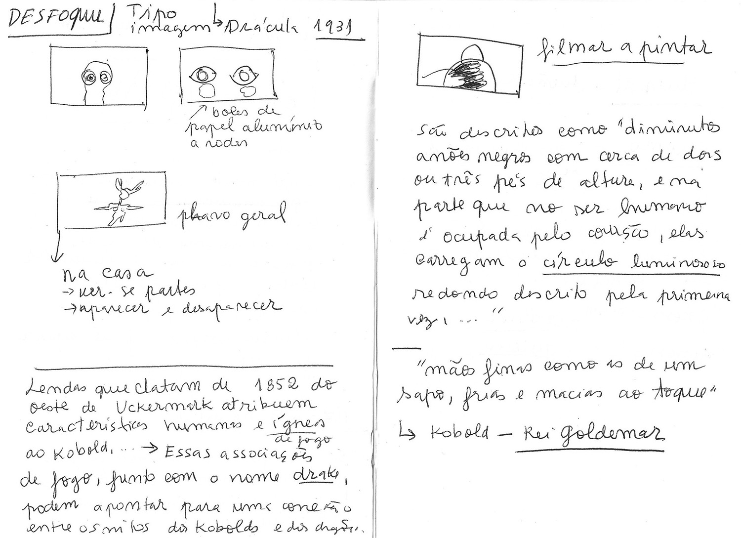 Figura 8 – Desenhos rápidos de estudos da ação e dos planos (storyboard), para a realização das gravações do vídeo, acompanhados de recolha de textos do livro “Mulheres que Correm com os Lobos: Mitos e Histórias do Arquétipo da Mulher Selvagem”, de Clarissa Pinkola Estés, 2016