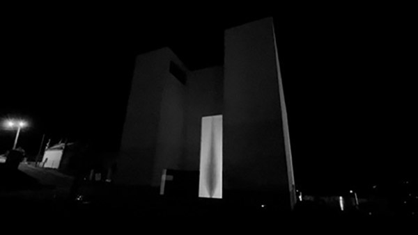 O primeiro espaço abordado foi a Igreja de Santa Maria, obra projetada por Álvaro Siza entre 1990 e 1996. O conjunto desenhado por Siza contempla igreja, capela mortuária, auditório, salas de catequese e residência do pároco. As obras emergem do espaço urbano envolvente, posicionando-se acima da avenida que ladeiam a igreja por uma plataforma revestida a granito, plataforma esta que é acessível através de duas escadarias e uma rampa. Uma das maiores atrações do espaço é a imponente porta de entrada da igreja, revestida em aço, incomum pela sua proporção invulgar tendo três metros de largura e dez de altura (Belo & Almeida, 2007). Pela singularidade deste espaço, o objeto de foco para a projeção foca-se nesta porta principal. Pela altura e largura atribuídas, possibilitam uma distância menor durante a projeção, permitindo que a luz seja mais forte. O material da mesma (aço) facilita o aproveitamento de um maior leque de cores com potencial durante a projeção. Este fator facilitou o exercício da projeção neste espaço, devido a uma maior liberdade na escolha de cores e texturas. Fator este que limitou e, por vezes, tornou um facto de exclusão de alguns espaços, devido a texturas que não permitem uma projeção com maior definição das cores projetadas. Grande parte dos espaços analisados, é revestido por pedra cinza-escura com musgo e presença de elementos naturais devido à sua exposição exterior. Este fator e certas distâncias, limita a luz e a definição de pixéis projetados. Quanto maior for a distância entre o projetor e o objeto de projeção, menor será o foco e a potência da luz que sai do projetor. Desta maneira, quanto mais neutras forem as texturas e as superfícies dos edifícios, maior será a probabilidade de uma projeção com mais qualidade e êxito.