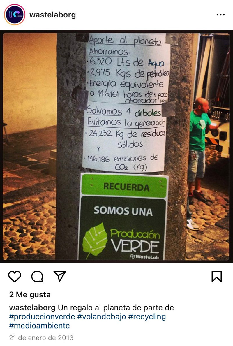 Waste Lab, un laboratorio de Educación Ambiental, en México, se inmiscuye en 2013 en el rodaje de la película Volando Bajo, e hizo público en redes sociales un post donde comenta su aporte al planeta, lo que habían salvado y cuántas emisiones de CO2 habían evitado.