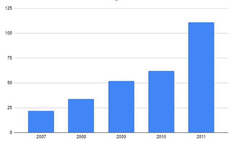 Gráfico 2 - Número de inscrições de curtas paraibanos no ComuniCurtas entre 2007 e 2011.