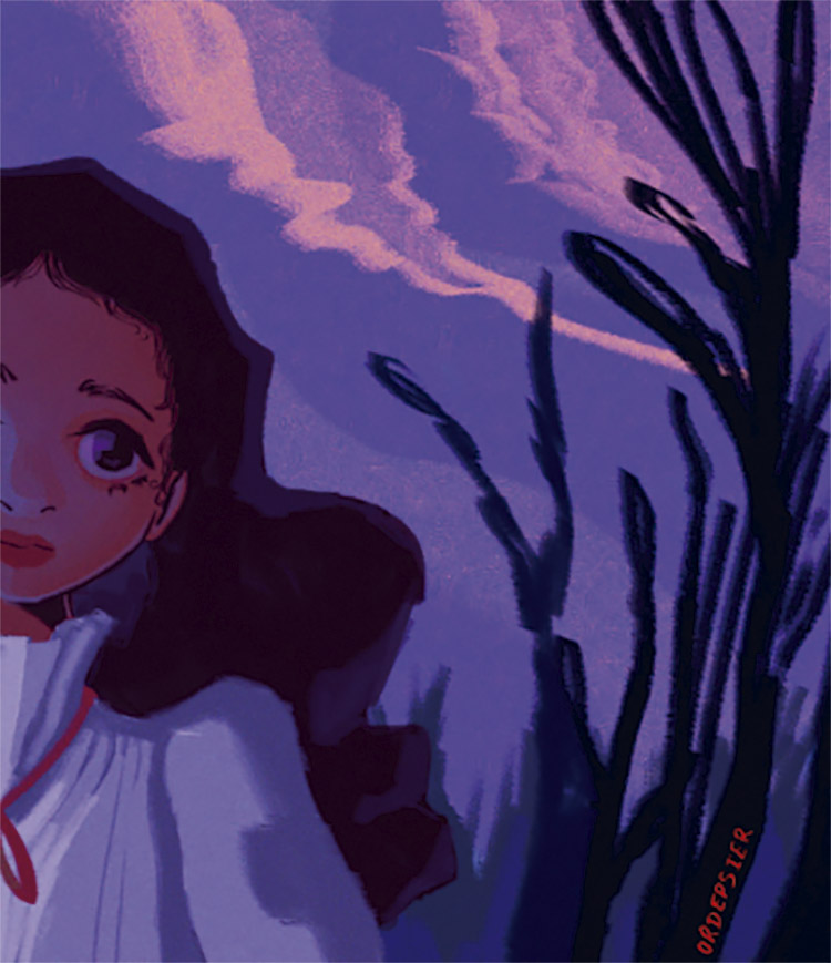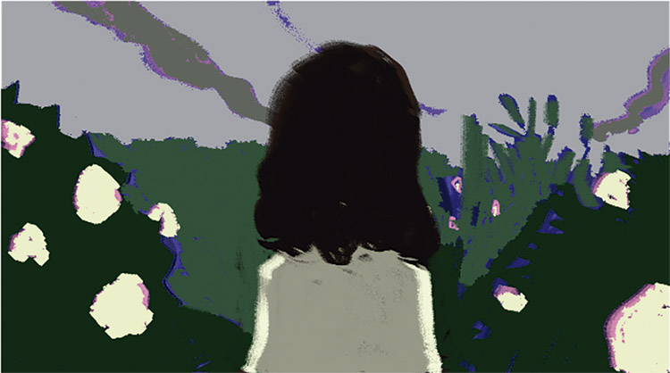Parte 3: Nesta parte o objetivo é demonstrar o amadurecimento da personagem. Para isso são utilizados tons de verde, cinza e amarelo. O verde é a cor do realístico e possui um efeito psicológico oposto ao roxo (HELLER, 2012), logo, ao ser utilizado demonstra que a personagem já não enxerga mais um mundo de fantasia. O cinza é a cor da neutralidade e da velhice (HELLER, 2012), e é utilizado para mostrar que o mundo já não a encanta mais. O amarelo claro é utilizado nas flores para substituir o branco, para demonstrar que já não há mais inocência neste mundo. O amarelo também é utilizado pois é considerada a mais ambígua das cores (HELLER, 2012), e possui o papel de representar a dúvida da personagem sobre como se sentir em relação a sua nova visão de mundo.