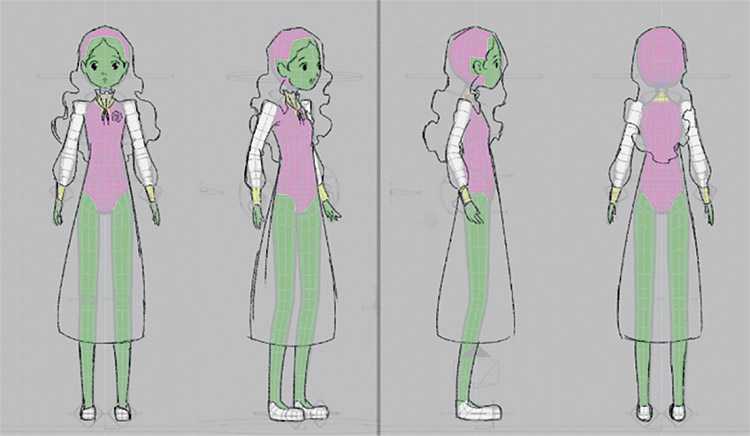 Após a concepção da personagem, foram feitos dois model sheets. Um model sheet é um material de referência criado para determinar a aparência da personagem. O primeiro foi criado para ser usado em planos abertos e médios e o segundo para ser usado em planos próximos. Essa divisão tem como objetivo simplificar o design da personagem nas cenas que utilizam seu corpo inteiro, para que seja mais fácil animá-lo, e preservar os detalhes nas cenas de planos próximos, para conseguir captar as nuances de sua expressão facial.