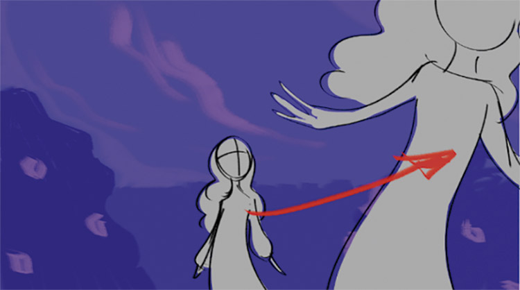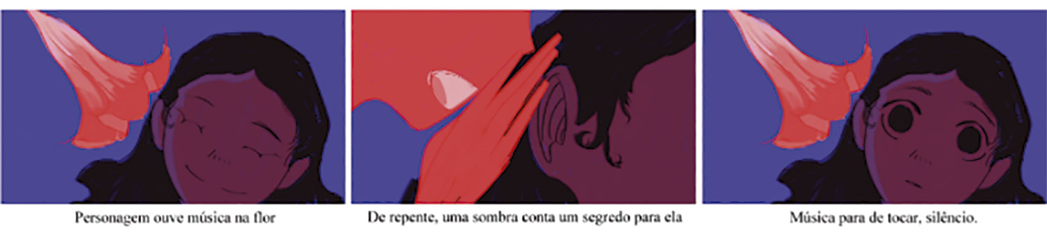 Após a criação da personagem, foi criado um storyboard. Durante esta etapa o objetivo era definir os enquadramentos e o ritmo da animação de acordo com o roteiro previamente relatado. Por exemplo, na cena abaixo, o plano próximo é utilizado para destacar a expressão da personagem ao ouvir uma música em uma flor. Em seguida, a cena é interrompida bruscamente para mostrar que algo de inesperado aconteceu e é utilizado um plano detalhe para evidenciar somente este acontecimento. Então, após o acontecimento, o plano da câmera volta a mostrar o rosto da personagem, denotando assim sua mudança de expressão facial e, por consequência, sua reação ao descobrir um segredo.