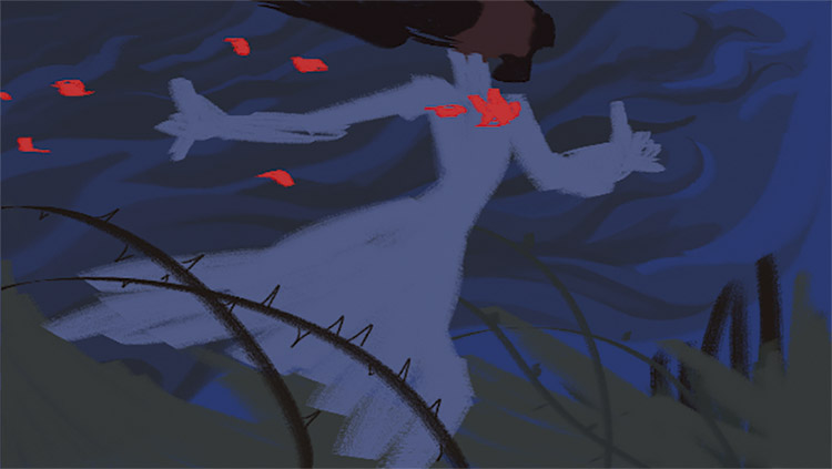 O branco é a cor escolhida para as rosas pois simboliza a pureza, a inocência (HELLER, 2012). O vulto que a personagem persegue possui a cor vermelha, pois esta possui um efeito psicológico contrário ao azul e ao branco (HELLER, 2012). Enquanto o azul remete a tranquilidade, o vermelho possui um caráter de dinamismo e instiga as ações da personagem.