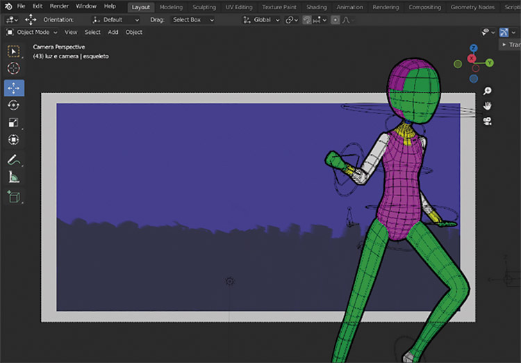 Em seguida, foi criado um modelo 3D no programa Blender com as formas básicas da personagem, com o objetivo de auxiliar na animação. Cada parte do modelo do corpo da personagem recebeu uma cor diferente para determinar a área onde ficaria o rosto, a gola e as mangas do vestido.