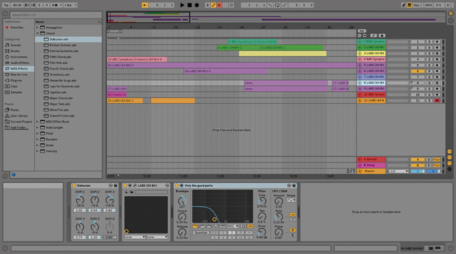 Para a parte sonora da animação, o autor fez o download de sons pelas plataformas Freesound e BBC Sound Effects, as quais disponibilizam efeitos sonoros para uso gratuito. Além disso, optou por compor o arranjo de notas e sons que foram utilizados durante o decorrer do curta animado. Essa escolha foi feita para aprofundar a relação do autor com a produção da animação e para que a trilha sonora refletisse a animação da melhor maneira possível. Para isso foi utilizado um programa de edição de áudio chamado Ableton, o qual possui instrumentos virtuais que possibilitam a criação de uma trilha sonora. Essa escolha ofereceu uma maior liberdade para a definição do ritmo e da atmosfera da animação.